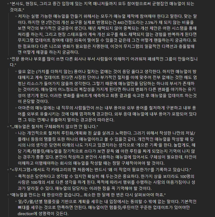 이번주에도 간간히 책을 읽고 있습니다. 책을 읽어내려가면 갈수록 매뉴얼의 의미와 기능에 흥미가 가네요.