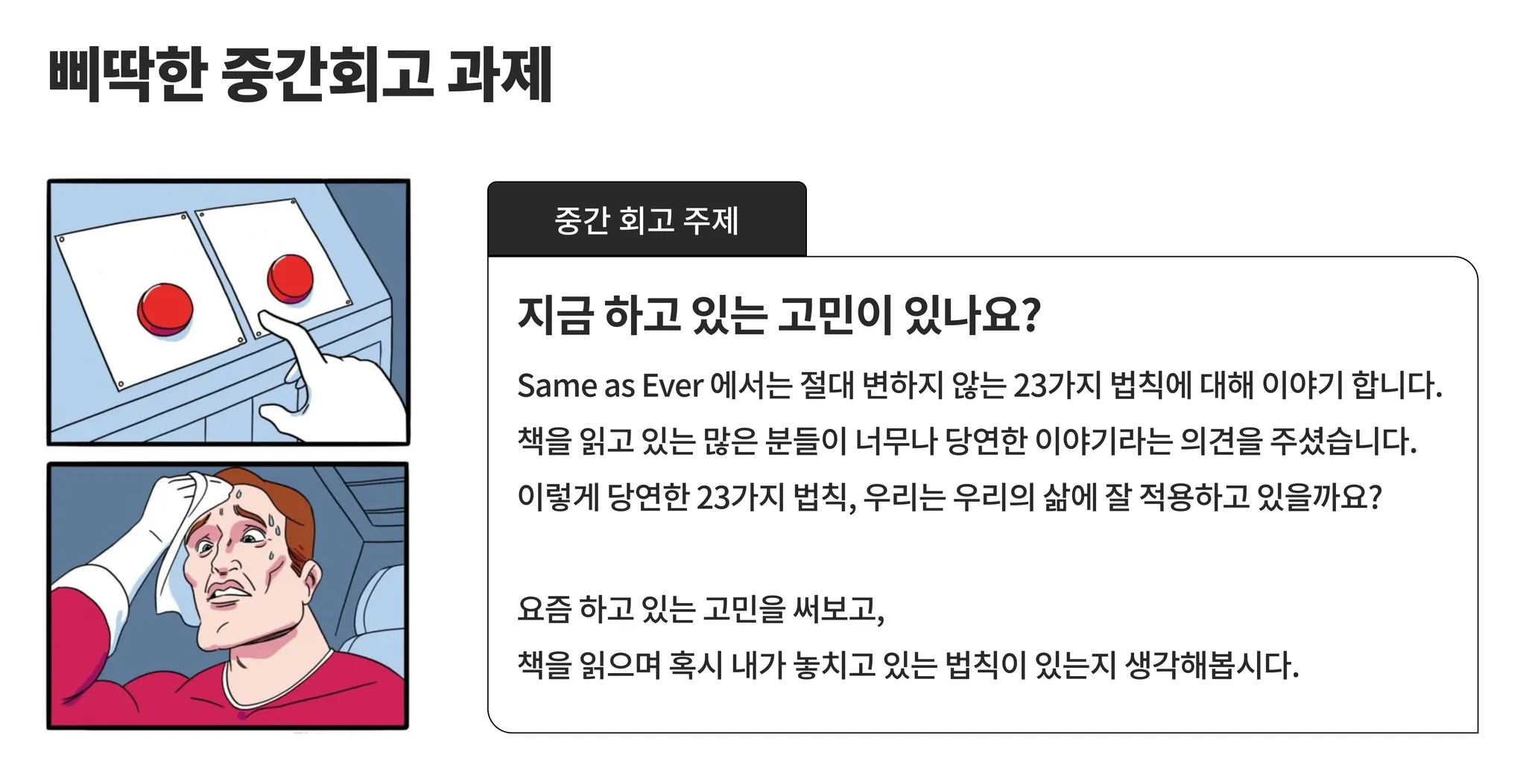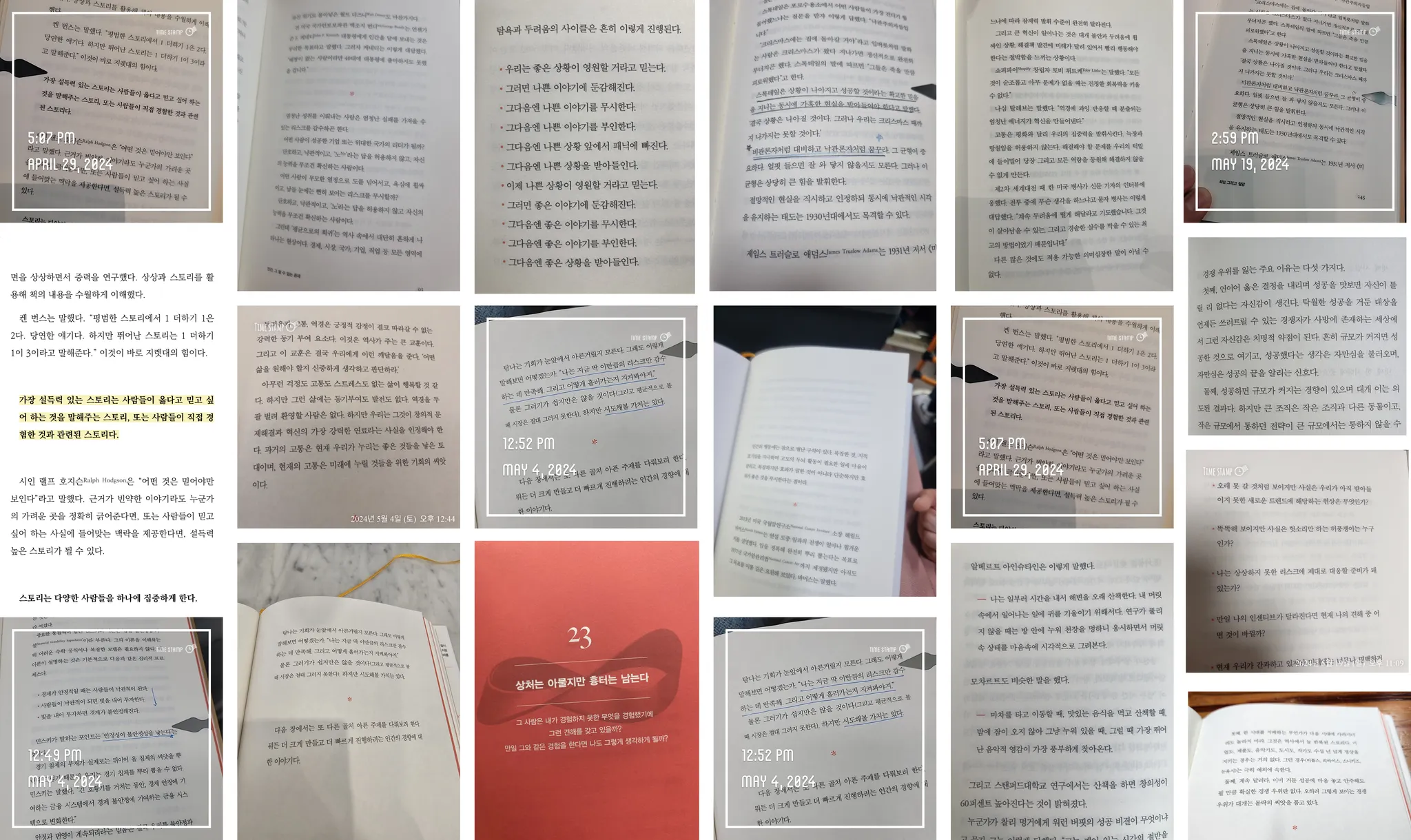 1~2주차, 3~4주차 각각 독서 범위를 읽으며 최소 한 번 이상 맘에 드는 문구가 있는 페이지를 사진으로 찍어서 올려주시면 됩니다. 책에 밑줄을 치거나 간단한 감상을 적어주시면 더 좋겠죠?