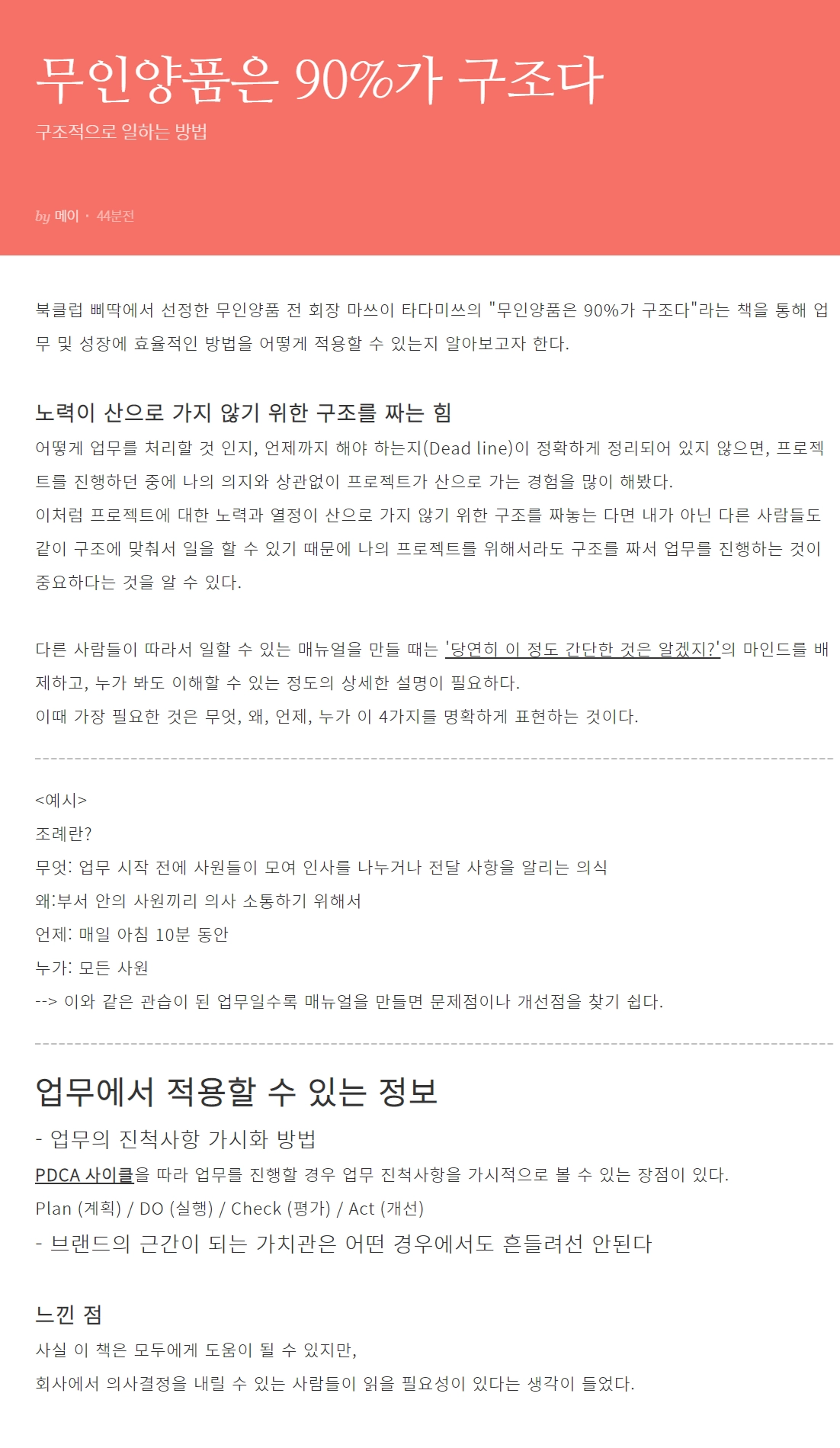 임채형 : 의사 결정권자가 보면 좋은 내용도 많지만, 매뉴얼 그 자체는 개인도 적용할 수 있을 것 같습니다. 책의 마지막 즈음에서도 나만의 무지그램을 만들라는 얘기가 나오는 것처럼요 :)